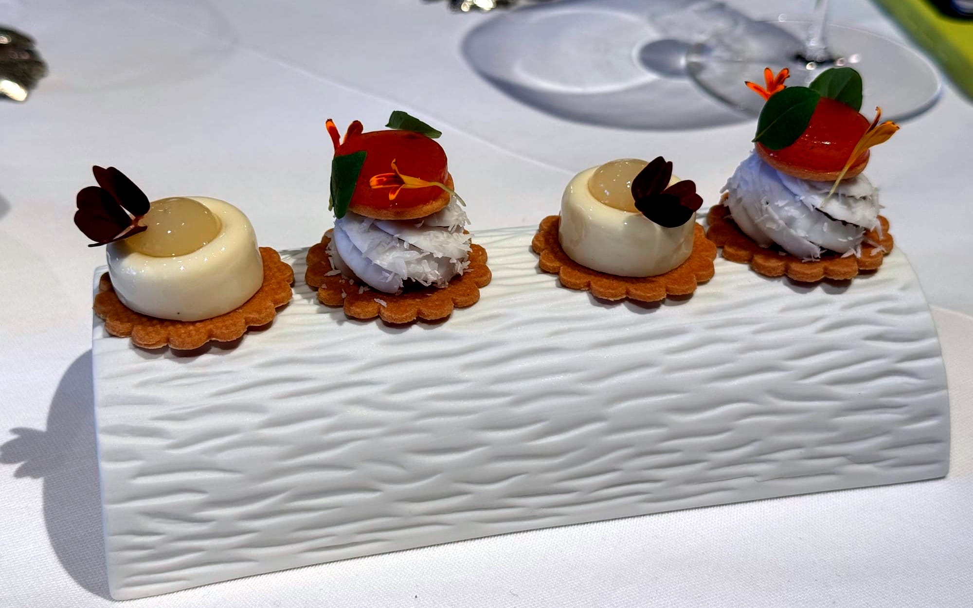 The first course, “sand carrot, fermented ginger,” showed how the kitchen extracts flavor through technique rather than adornment. The carrot was braised in limestone water, which tightens sweetness and keeps the fiber supple, then filled with a fine carrot farce. Fermented ginger added warmth without noise. A wonderful warm brioche accompanied the dish, soft and delicately aromatic, making the composition feel complete without adding weight.