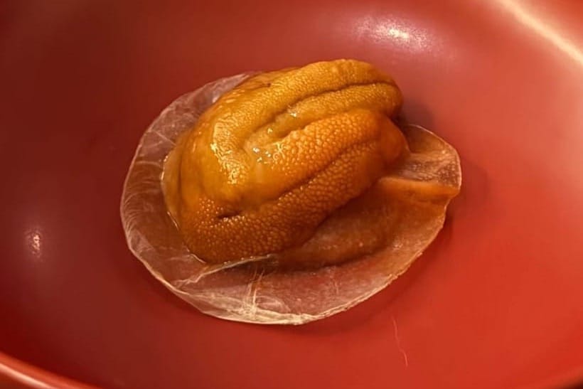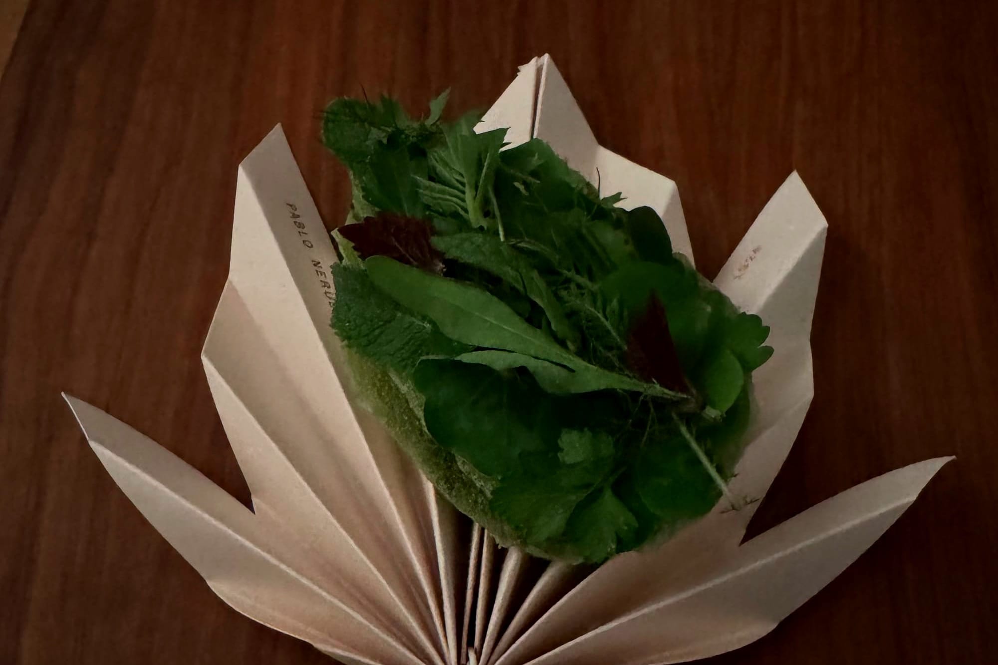 Shiokara and squid fossil introduced fermentation and depth. Then came Nanakusa-no-sekku, presented as a single leaf topped with delicate herbs, served on folded origami. The reference to the Japanese tradition of the seven herbs of early spring was subtle but clear, a moment of lightness and renewal within the menu. It prepared the palate before the sequence culminated in a sea urchin ravioli that balanced richness with clarity.